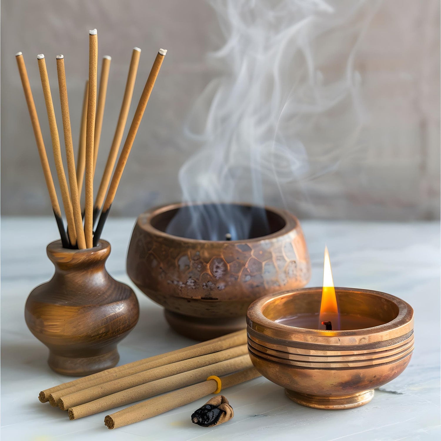 Los inciensos se pueden encontrar en forma de espiral, cono, vara hueca o vara maciza. Las varitas de incienso son las más populares y se fabrican con varitas de bambú recubiertas de polvo de incienso.